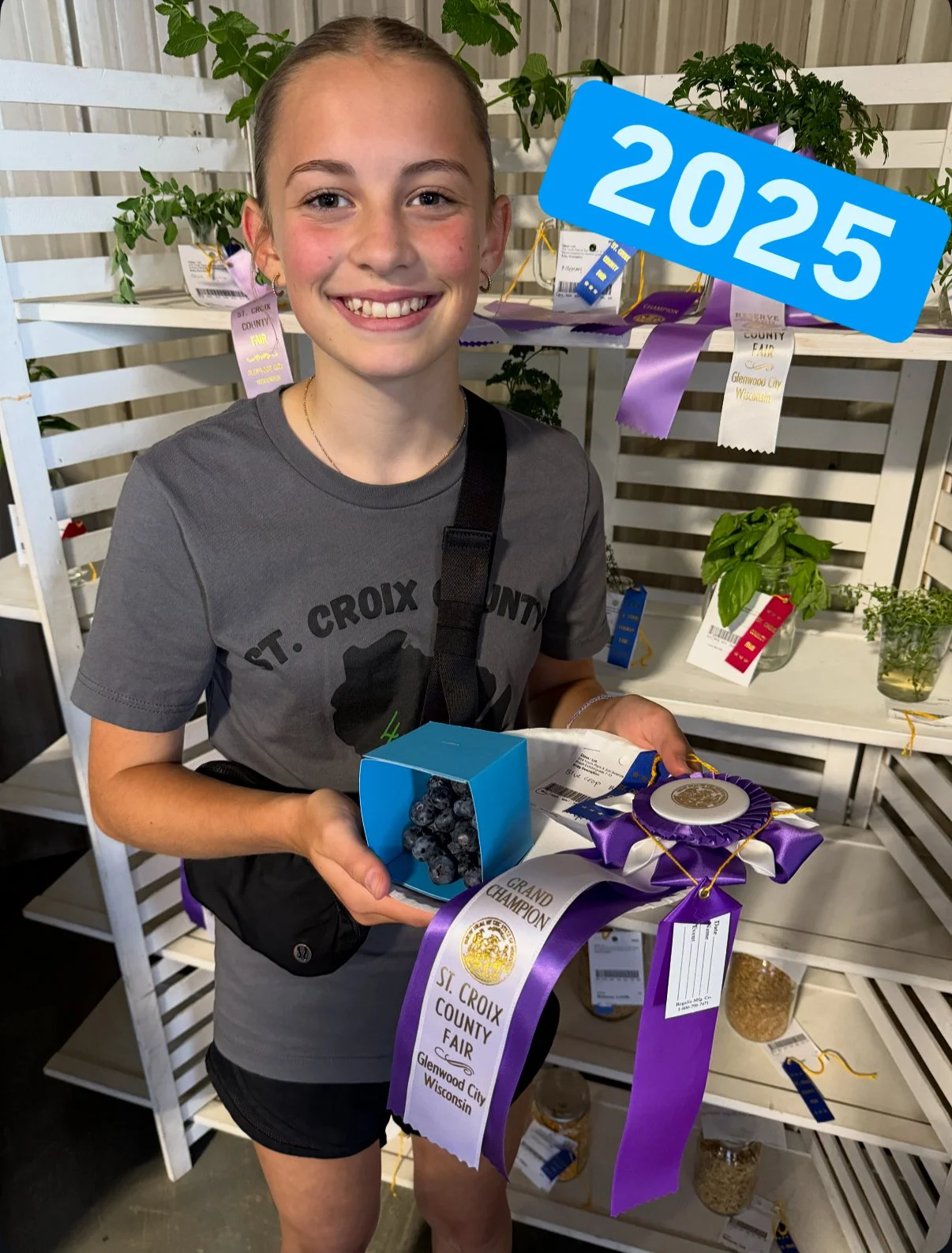 Last year Elena received Grand Champion for her Blueray blueberries at the 2024 St. Croix County Fair. This year at the 2025 fair, Norah claimed the title of Grand Champion! She brought a few different varieties, but the judge’s favorite was Bluecrop. Congratulations to Norah and all those hard working kids that bring such great entries to the fair!